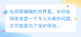 在视频编辑的世界里,水印去除常常是一个令人头疼的问题。它可能是为了保护原创者或品牌权益,但对于希望使用视频素材的用户来说,这些水印往往会遮挡重要的内容,甚至影响观看体验。特别是对于那些寻求高清画质的视...