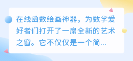 在线函数绘画神器,为数学爱好者们打开了一扇全新的艺术之窗。它不仅仅是一个简单的工具,更是一个能够激发创意、展现数学之美的平台。在这个充满想象与可能的世界里,每一个函数、每一条曲线都如同画笔下的色彩,构...