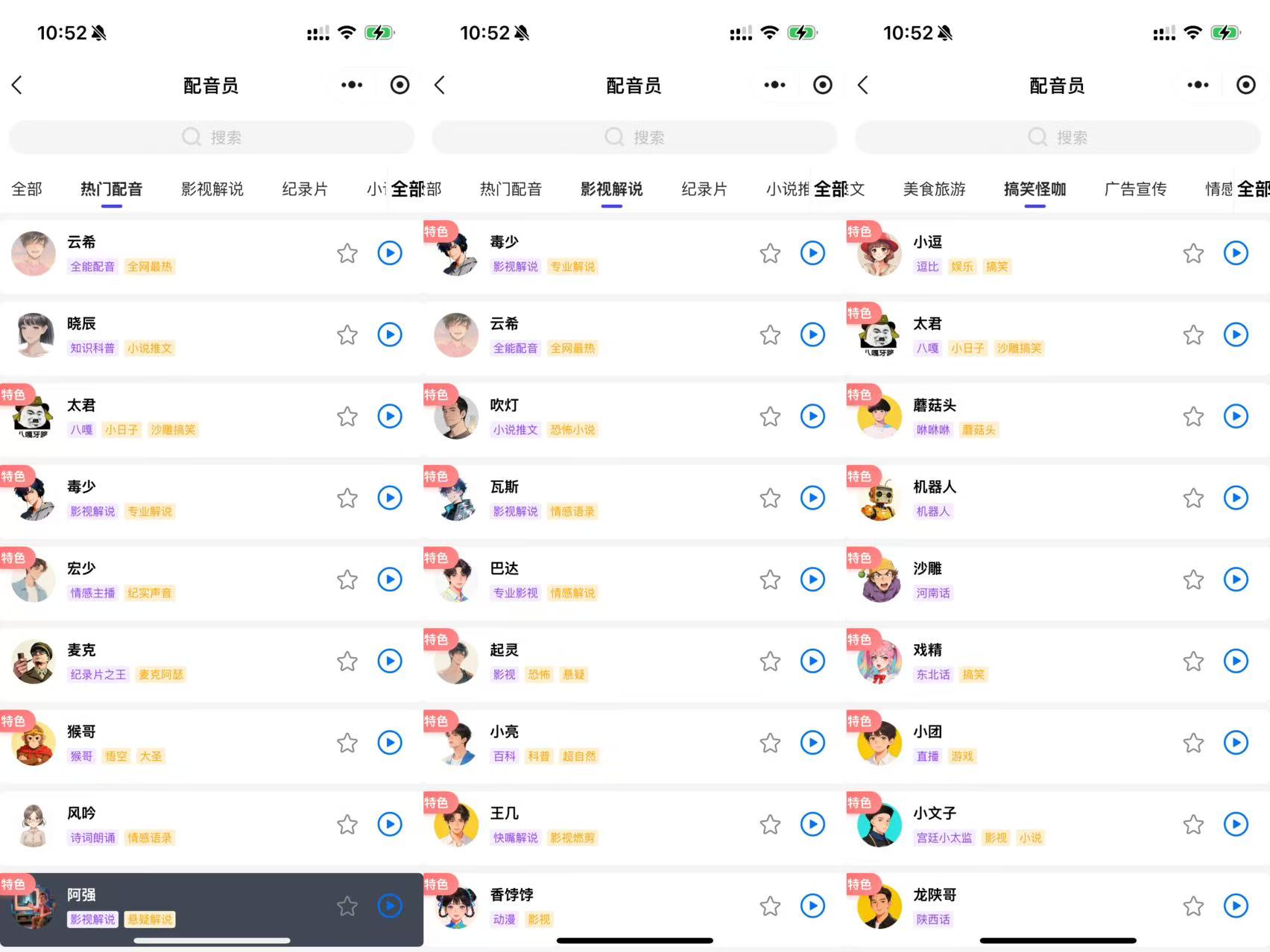 总量突破 1300+,剧情、解说、口播、带货…通通覆盖!抖音、快手爆火音色全都有:? 猴哥(搞笑 / 剧情反转)? 英子(情感 / 生活旁白)? 毒少(热点吐槽 / 犀利解说? 云希(温柔讲故事 / ...