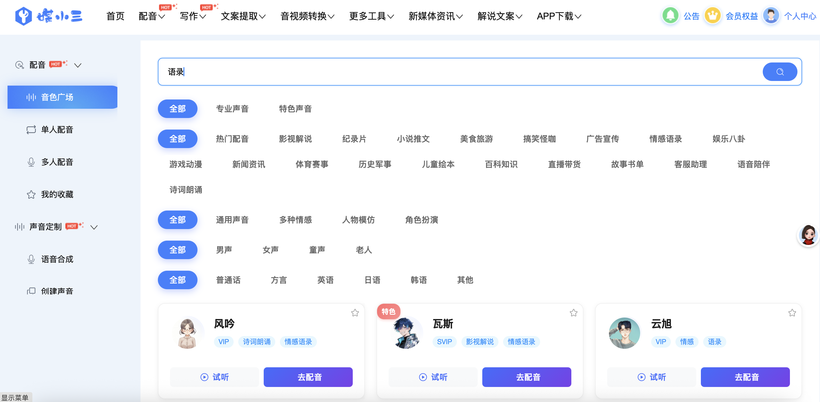 媒小三快手励志语录合成配音拥有1000+音色,搜索“语录“,”涵盖男声、女声、沉稳旁白、温柔动情等多种风格。制作快手励志语录短视频时,你可以根据语录风格选择音色: